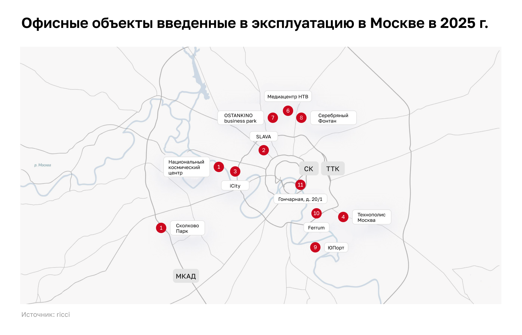 За девять месяцев 2025 года в эксплуатацию введено 11 крупных офисных объектов, среди которых: “Национальный космический центр” ( 200 тыс. кв. м), Slava, 4-я очередь (112 тыс. кв. м), iCity “Башня Space” (91,4 тыс. кв. м), ОЭЗ «Технополис Москва» (30 тыс. кв. м), “Сколково Парк”, корпуса 3 и 4 (27,3 тыс. кв. м), “Медиацентр НТВ” (18 тыс. кв. м) и Ostankino Business Park (17,1 тыс. кв. м).