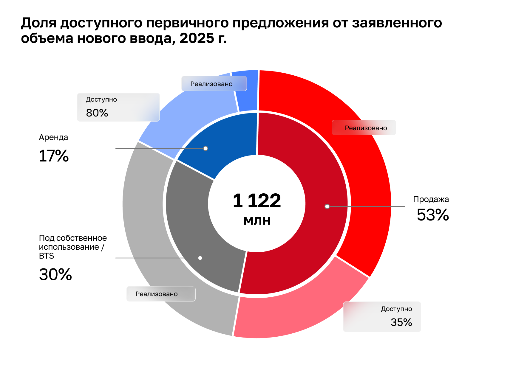 Согласно данным инвестиционно-консалтинговой компании Ricci, 44% введенных площадей занимают штаб-квартиры и объекты built-to-suit, еще 41% предназначен для продажи, а 15% — для аренды.