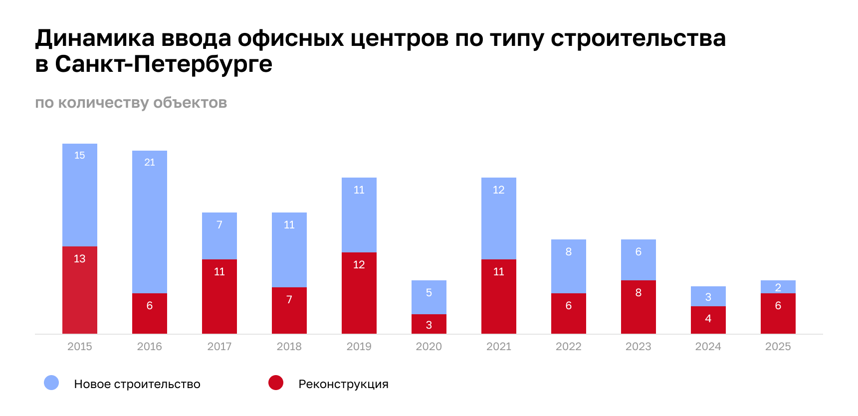 Третий год подряд реконструкция опережает новое строительство и по количеству объектов, и по площади. С начала 2025 года завершена реконструкция шести зданий под офисные функции, тогда как новое строительство представлено лишь двумя объектами. В ближайшие полгода ожидается завершение реконструкции еще не менее шести зданий, тогда как единственным новым проектом станет «Орими Центр». Сейчас на стадии реконструкции под бизнес-центры находятся такие исторические объекты, как здание Министерства внутренних дел на Фонтанке, здание Карточной фабрики на пр-те Обуховской Обороны, здание заводоуправления Сталепрокатного завода на Васильевском острове, здание фабрики «Скороход» и другие.