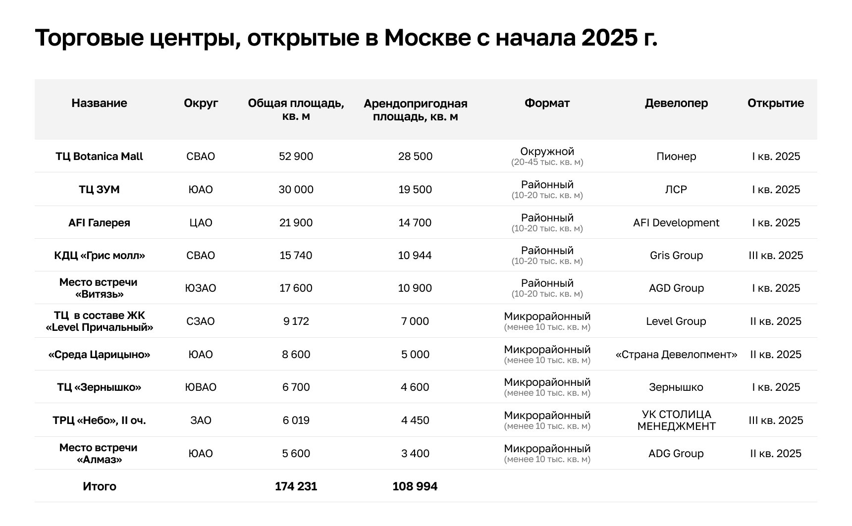 Среди анонсированных к открытию в 2025 году объектов ожидается открытие одного торгового центра регионального формата — Avenue Sever (GLA – 60 тыс. кв. м). Также запланирован ввод двух объектов окружного уровня: ТЦ «Краски» (GLA – 35 тыс. кв. м) и МФК Lakes (GLA – 24,1 тыс. кв. м). При этом на районные и микрорайонные торговые центры приходится почти половина (46,3%) совокупного объема запланированного ввода, что подтверждает устойчивый спрос на малоформатные проекты, ориентированные на жителей ближайших районов.