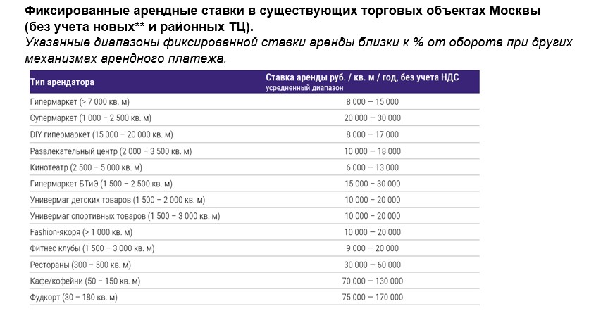 Комбинированная ставка аренды остается наиболее популярным типом арендного платежа в торговых центрах Москвы. При такой схеме в качестве арендной платы используется либо минимальный фиксированный платеж, либо % от товарооборота арендатора, в зависимости от того, что выше. Собственники новых ТЦ, привлекая арендаторов в свои объекты, часто предлагают более привлекательную стоимость аренды с последующей консолидацией* платежа.