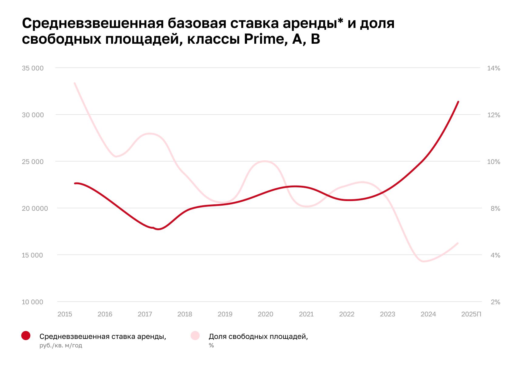 Средневзвешенная базовая ставка аренды (классы Prime, A и B) по итогам девяти месяцев 2025 г. выросла на 32% (30 432 руб./кв. м/г.) по сравнению с аналогичным периодом прошлого года. Средневзвешенная базовая ставка аренды (классы Prime, A и B) до конца 2025 г. составит 30 916 руб./кв. м/г.