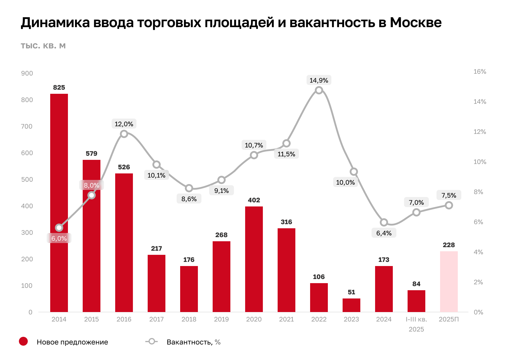 2025-й уже стал лидером по объемам ввода в эксплуатацию новых ТЦ: за первые три квартала –около 110 тысяч кв. м. новых объектов, а до конца года планируется ввод еще свыше 200 тысяч кв. м. Открытие части из них может быть перенесено на первую половину 2026 года. При этом, каждый второй новый объект в торговой недвижимости – районный ТЦ. Это означает, что последствия дорогих денег для рынка и возможную нехватку новых торговых центров мы увидим не ранее конца следующего года. Замедление ввода к концу следующего года сохранит низким уровень вакансии даже в случае роста арендных ставок.