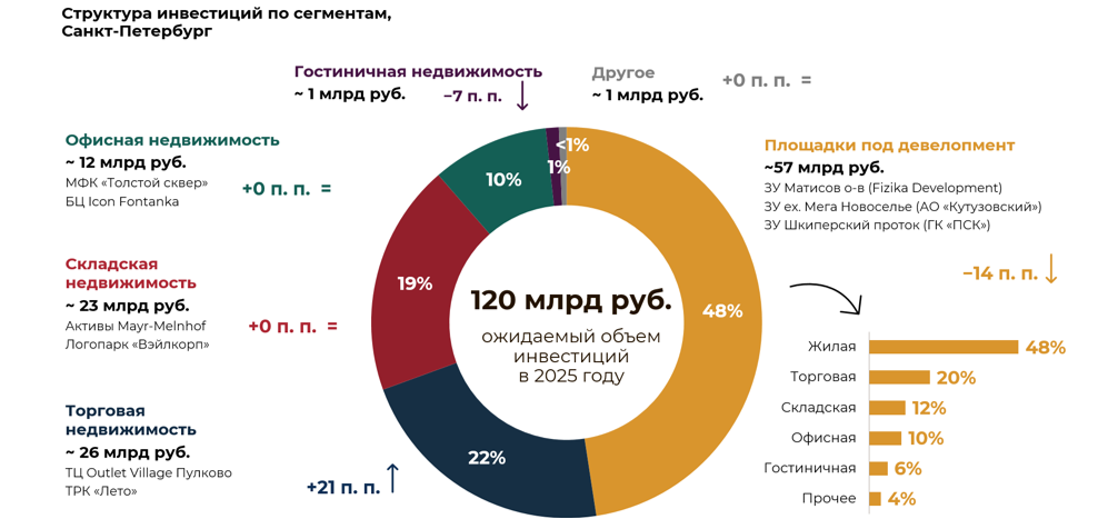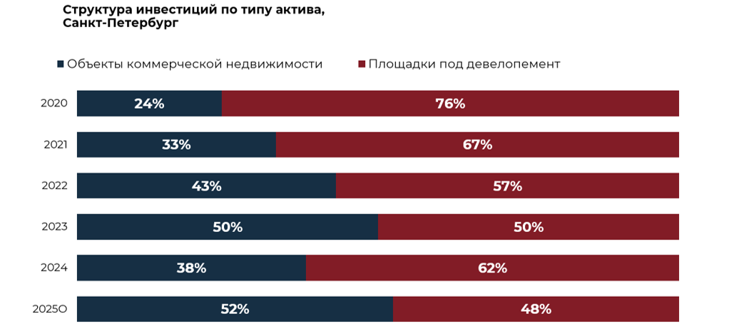 Основной объем инвестиций в 2025 году пришелся на площадки под девелопмент – порядка 57 млрд руб., или 48%. При этом традиционно они привлекали более половины всех вложений. Крупнейшие сделки в этом сегменте были связаны с приобретением земельных участков на Матисовом острове, бывшей площадки ТЦ «Мега Новоселье», а также территории на Шкиперском протоке.