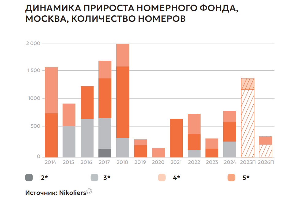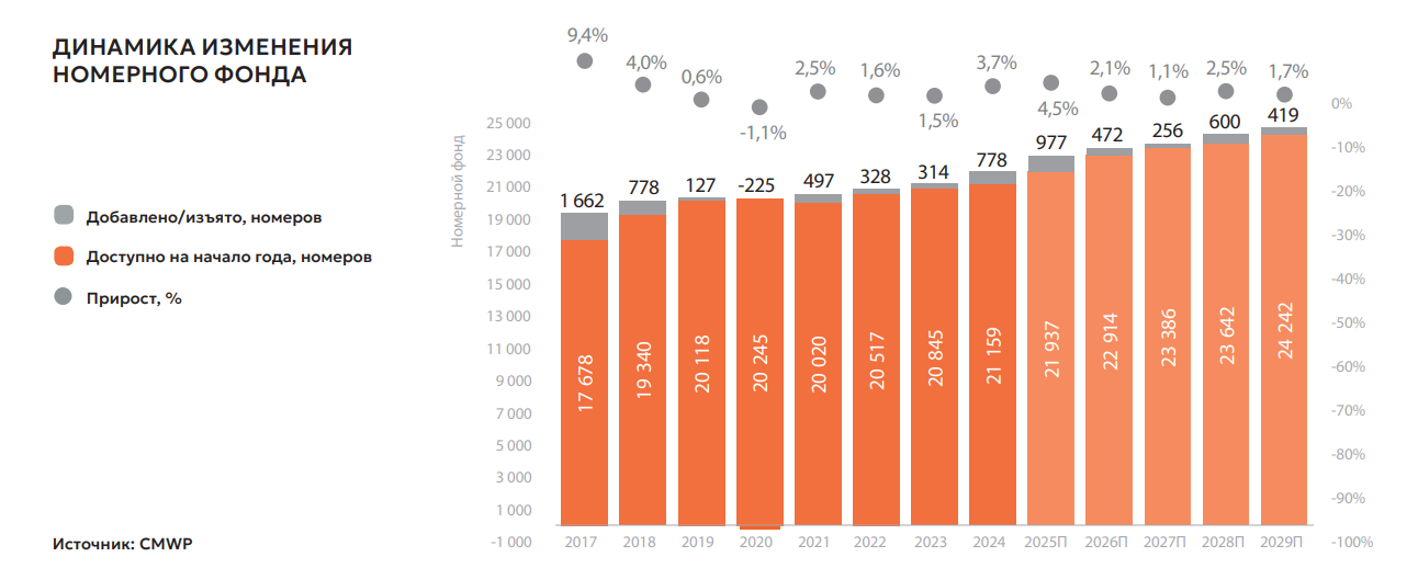 Темпы роста качественного номерного фонда в России в ближайшие два года будут на уровне 5–6% в год. В 2026–2027годах ожидаем введение в эксплуатацию большого количества номеров, при этом пик открытий новых отелей придется на период 2027–2029 годов, далее — уже более плавный и распре деленный ввод, с учетом возможных корректировок сроков ввиду объективных факторов.