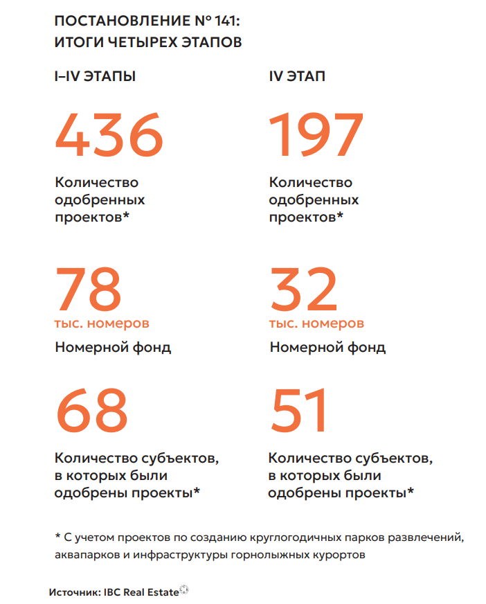 Однако ввод по итогам года станет рекордным: государство продолжало поддерживать отрасль, расширяя программы льготного кредитования. Только в рамках Постановления №141 в четвертом отборе предполагается строительство 197 проектов, из которых 106 отелей категории 3–4*, 64 — категории 5*, а также 27 — по запуску круглогодичных парков развлечений, аквапарков и инфраструктуры горнолыжных курортов, перечисляют в IBC Real Estate .