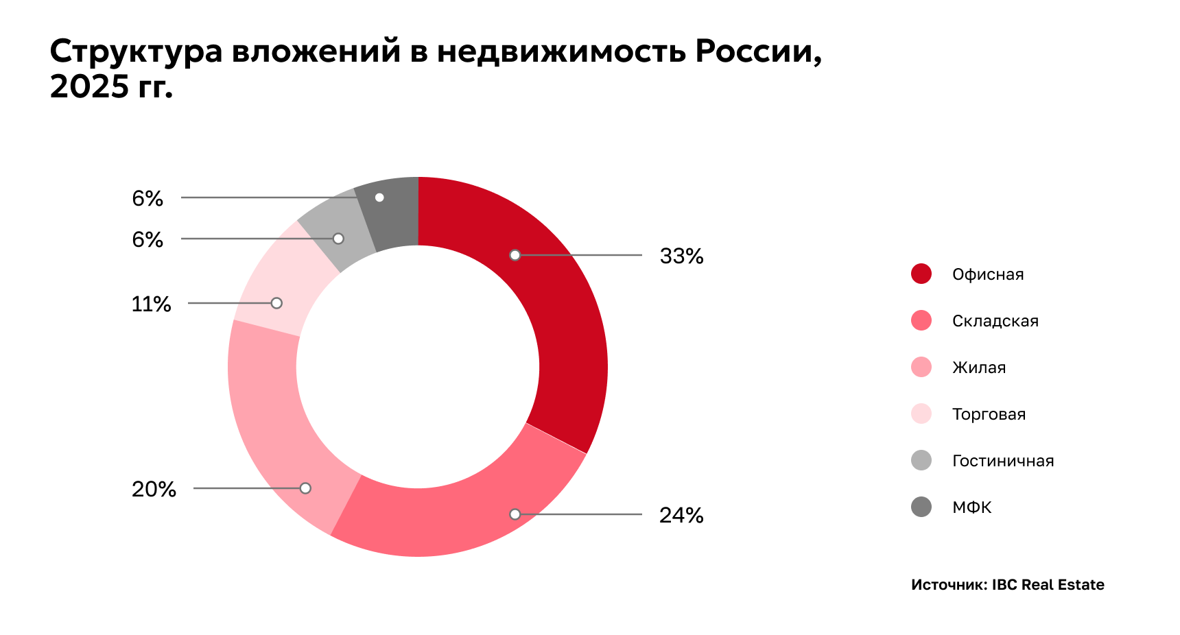 В наступившем году, ввиду общего курса на стабилизацию, инвестиционный рынок продолжит возвращение к сбалансированному состоянию. По нашим прогнозам, совокупный объем вложений в недвижимость Москвы по итогам 2026 года может составить 450-500 млрд руб., а в целом по России — около 600-650 млрд руб. Если говорить отдельно по сегментам, в 2026 году мы ожидаем некоторую стабилизацию инвестиционной активности в офисах. Коррекция объемов вложений с постепенным восстановлением интереса к 2027 году предполагается в складской недвижимости. В торговом сегменте сохранится активность с участием как профессиональных игроков, так и новых инвесторов. В секторе гостиничной недвижимости, после периода роста объема вложений, мы ожидаем стабилизацию. Жилые застройщики продолжат занимать выжидательную позицию до смягчения денежно-кредитной политики.