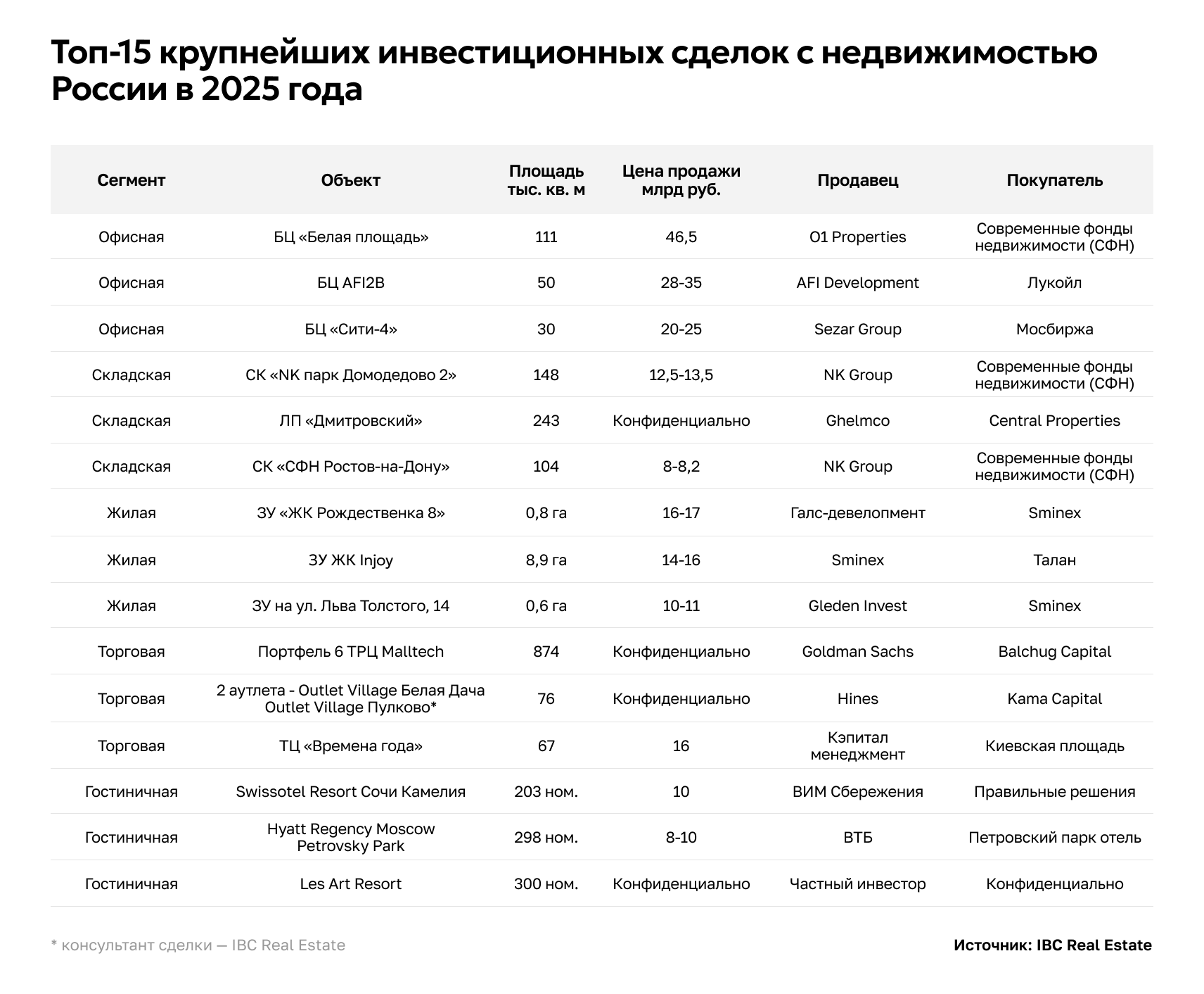 В ушедшем году было реализовано 12 транзакций с объектами, ранее принадлежавшими иностранным компаниям, в то время, как в 2024 году их количество составило 18. Сократился и объем таких сделок — 88 млрд руб. против 99 млрд руб. годом ранее. Крупнейшими сделками 2025 года стали продажа портфеля торговых центров компании Malltech и двух аутлет-центров компании Hines — «Белая дача» в Москве и «Пулково» в Санкт-Петербурге.