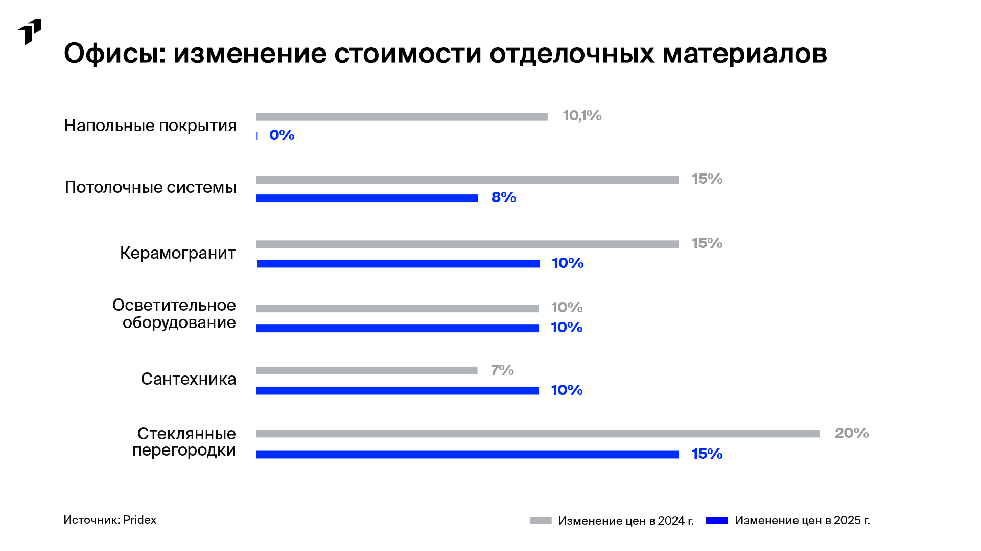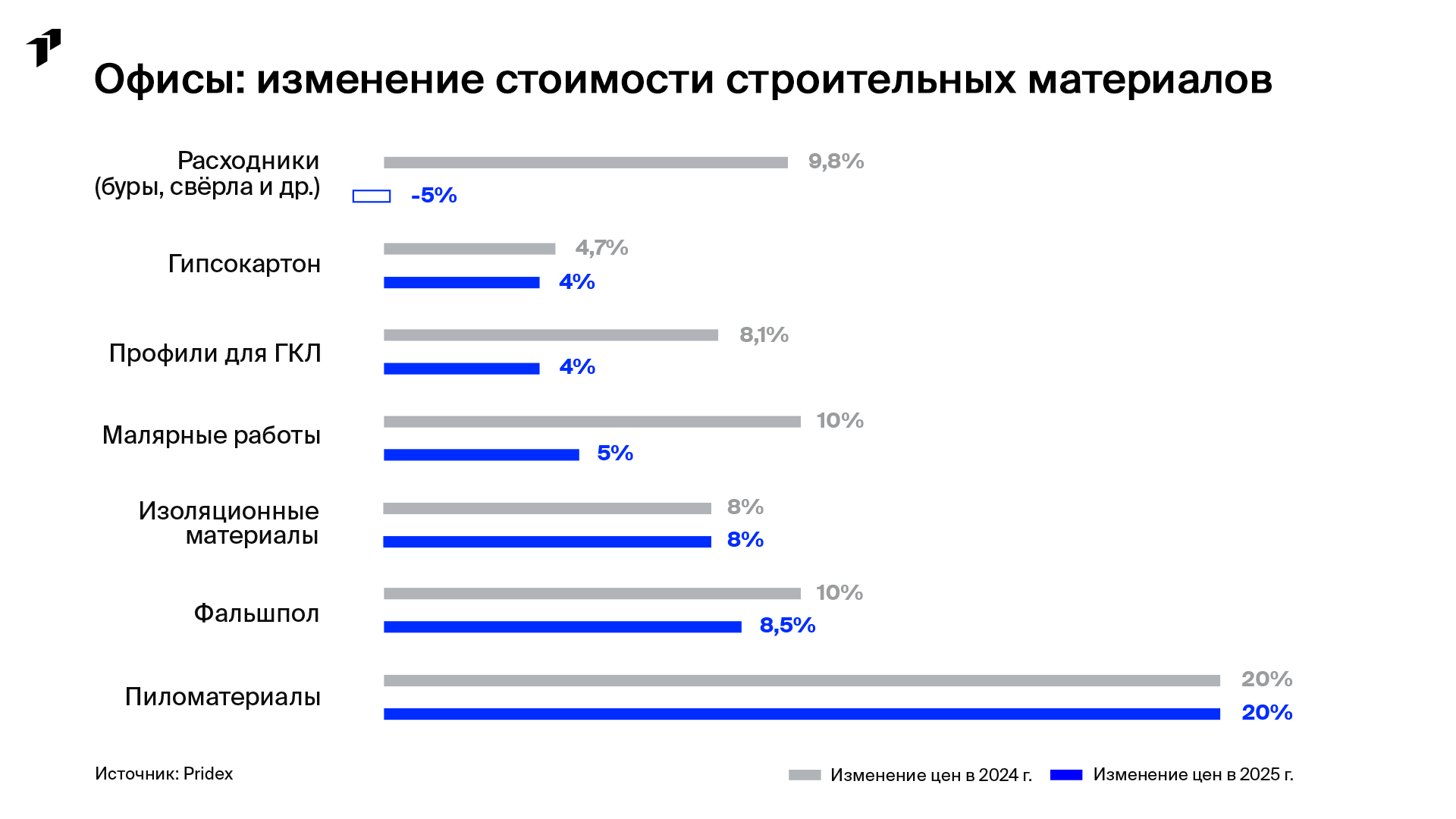 Pridex, технологическая и строительная компания в сфере недвижимости, проанализировала изменения в стоимости материалов и оборудования для офисного строительства за 2025 год. Исследование охватывает три основных типа продукции: строительные (черновые) материалы, отделочные (чистовые) материалы и инженерное оборудование.