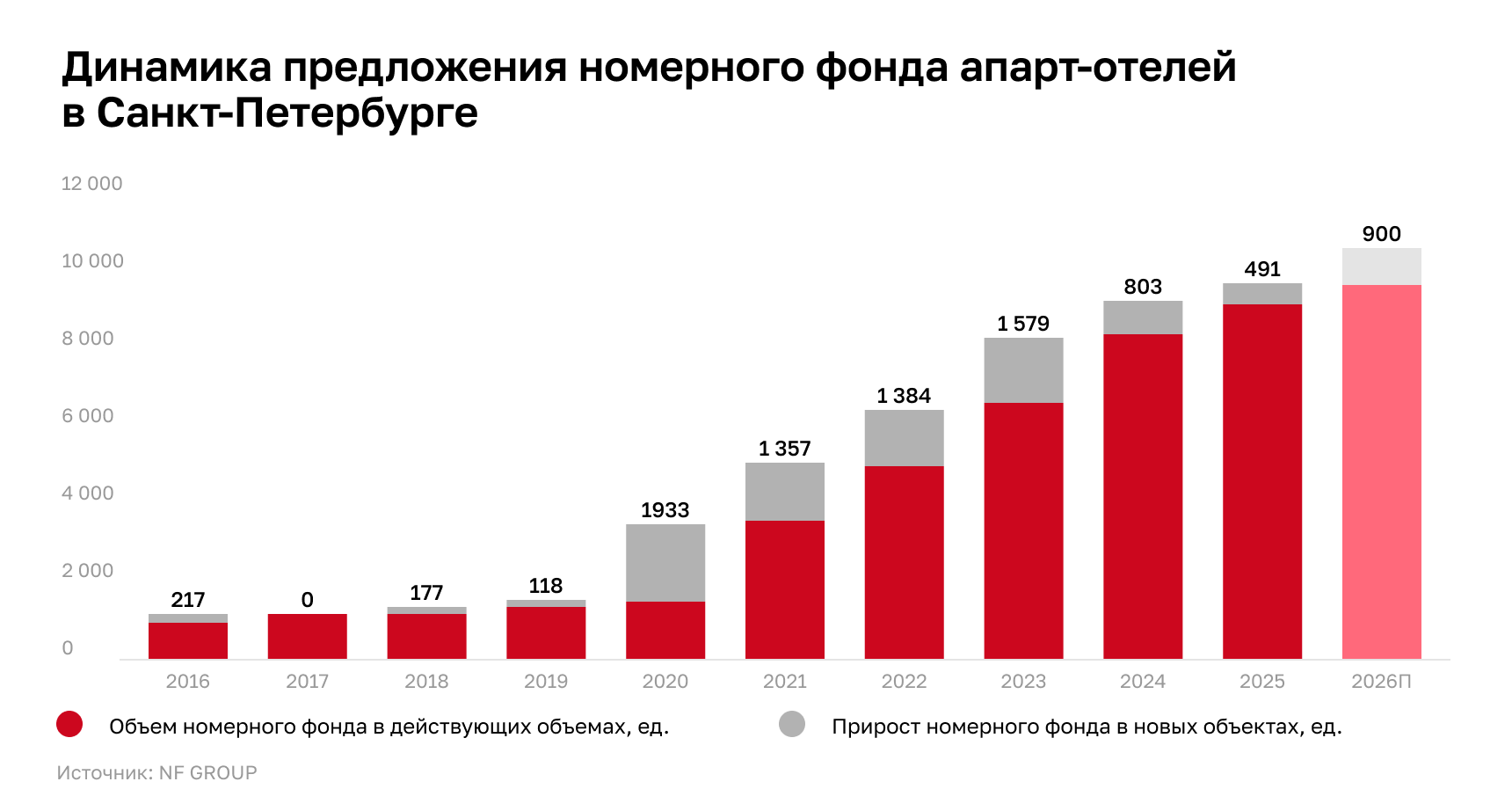 В 2026 году ожидается ввод трех классических гостиниц совокупным номерным фондом порядка 0,6 тыс. номеров. В сегменте апарт-отелей заявлено открытие девяти объектов с суммарным номерным фондом около 0,9 тыс. юнитов.