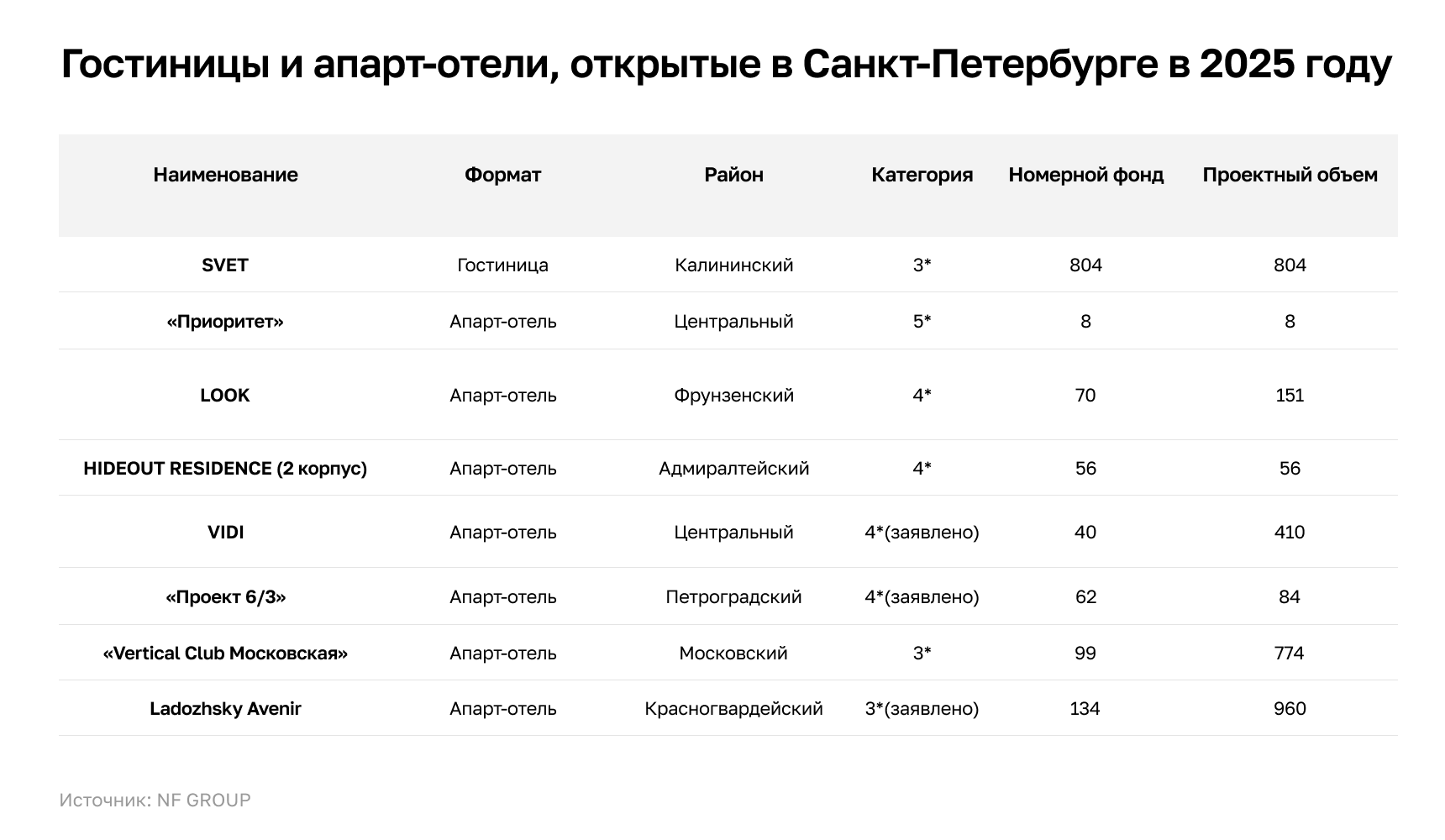 По итогам 2025 года в Санкт-Петербурге открылась одна гостиница SVET категории 3* на 802 номера. Объект расположен в Калининском районе и вошел в топ-5 отелей города по объему номерного фонда. Стоит отметить, что SVET стала вторым объектом, реализованным в Северной столице по программе льготного кредитования (первым был «Domina Пулково Отель» категории 5* на 253 номера, открытый в 2024 году).