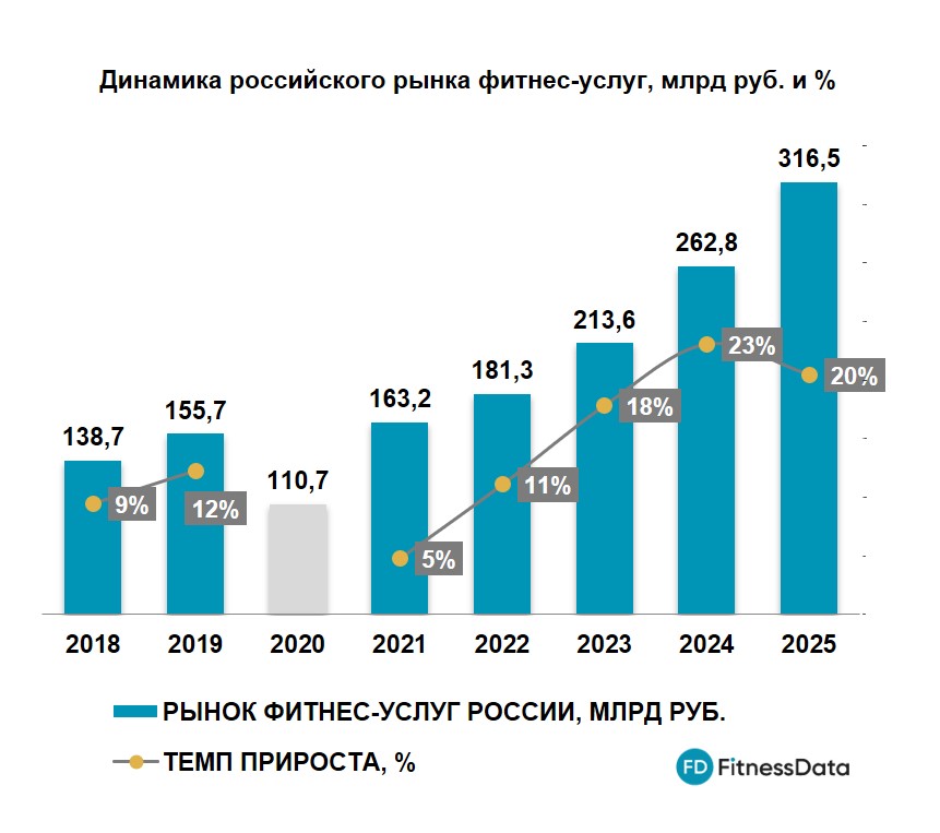Общий объем российского рынка фитнес-услуг в 2025 году достиг 316,5 млрд рублей. Это более чем в два раза превышает доковидные значения 2019 года. Темпы прироста составили 20%, что является вторым самым высоким показателем за последнее десятилетие (без учета восстановительного роста после COVID-19).