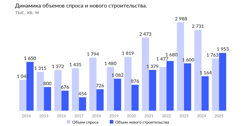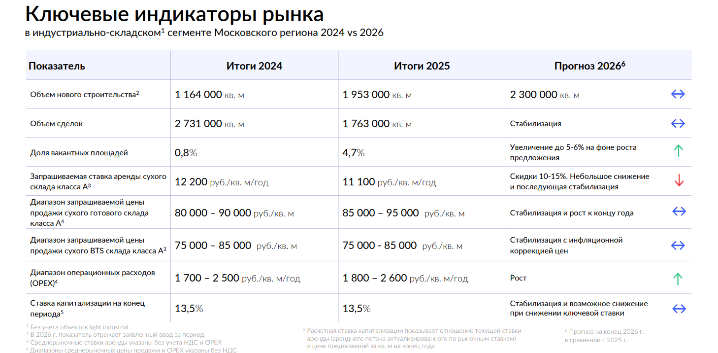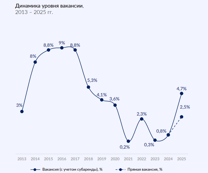 В среднесрочной перспективе сохраняются предпосылки для дальнейшего увеличения вакантности, обусловленные значительными объёмами строящихся спекулятивных площадей, которые продолжат поступать на рынок в течение 2026 года.