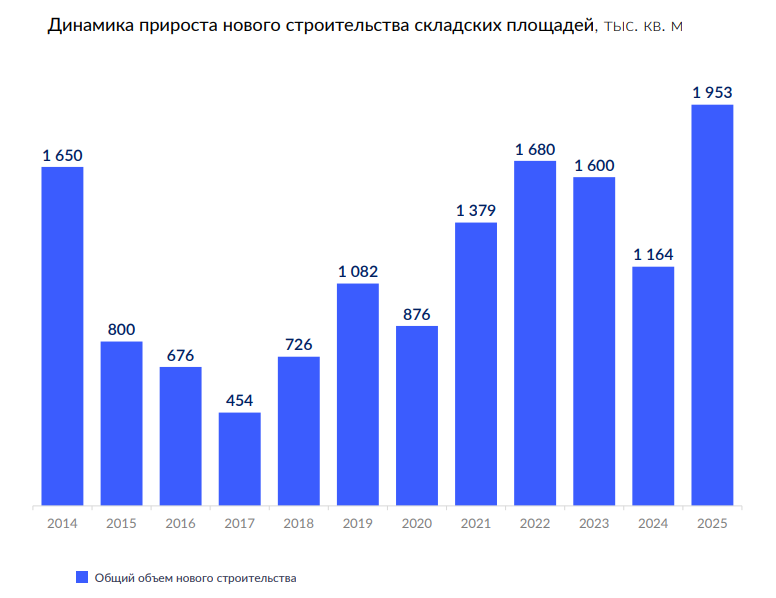 По итогам 2025 г. объем нового строительства качественной складской недвижимости Московского региона достиг исторического максимума за 12 лет — 1,95 млн кв. м. Данный показатель, превысивший результат 2024 года на 68%, является реализацией строительного бума, запущенного в период околонулевой вакантности и ажиотажного спроса 2023–2024 годов.