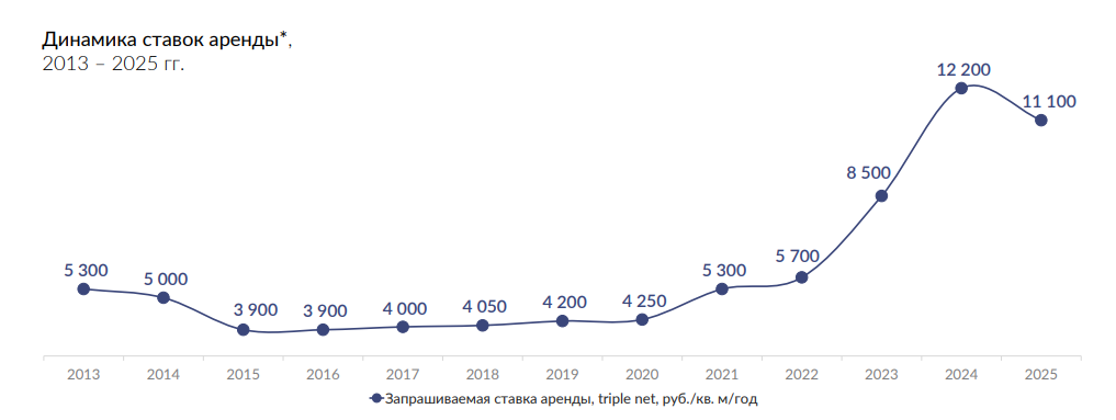 По итогам 2025 года ставка капитализации стабилизировалась на отметке 13,5%, фиксируя восходящий тренд, наблюдавшийся с 2021 года.