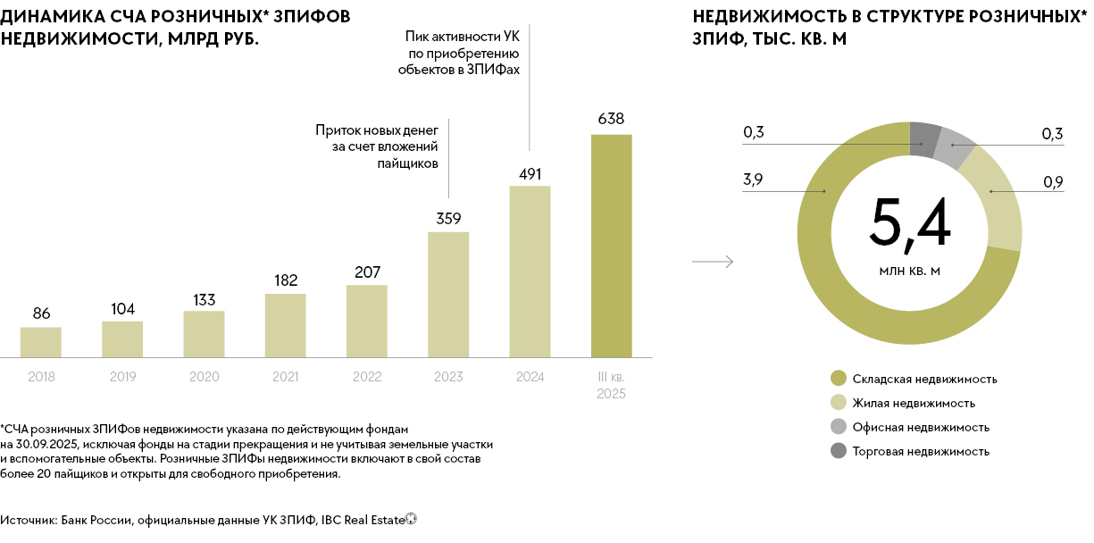 Наиболее крупными сделками с ЗПИФами по итогам 2025 года стали покупка УК «Современные фонды недвижимости» логистических парков «NK парк Домодедово-2» (148 тыс. кв. м) и «NK парк Вешки-2» (77,4 тыс. кв. м) у NK Group, приобретение Central Properties последнего актива бельгийской Ghelamco — складского комплекса в Дмитрове (243 тыс. кв. м). В итоге, по оценкам IBC Real Estate, 3,7 млн кв. м из общего объема качественных складских площадей России уже находятся в составе розничных ЗПИФов. Таким образом, им принадлежит каждый двадцатый квадратный метр складской инфраструктуры.