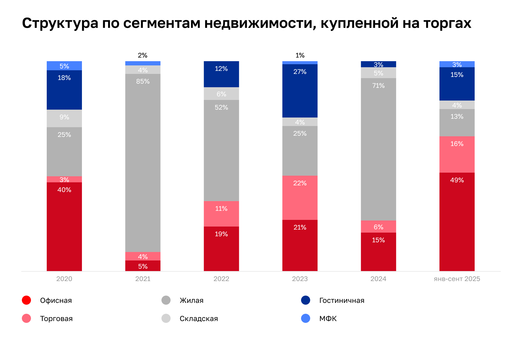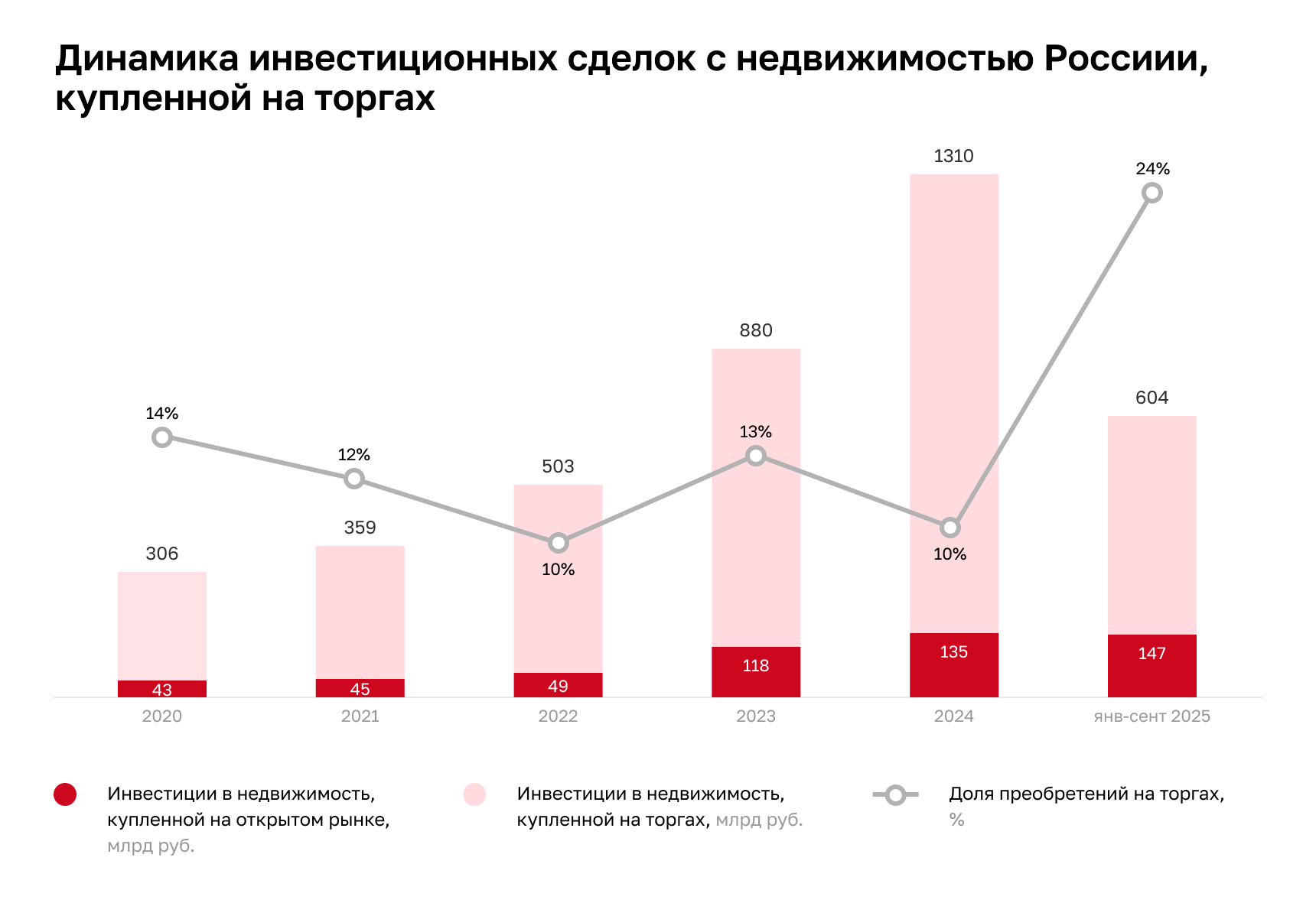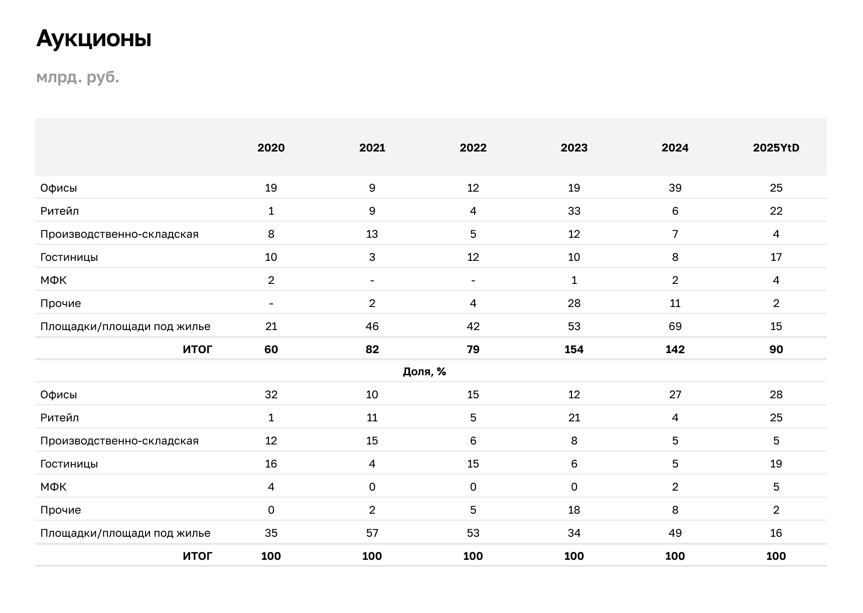 В абсолютных значениях объём покупок на торгах за 9 месяцев 2025 года составил около 150 млрд руб., что более чем на четверть выше годовых значений в 2022-2023 гг. Микаэл Казарян, член совета директоров, руководитель департамента рынков капитала и инвестиций IBC Real Estate, основной тенденцией в аукционных продажах недвижимости считает увеличение предложения качественных стабилизированных активов.