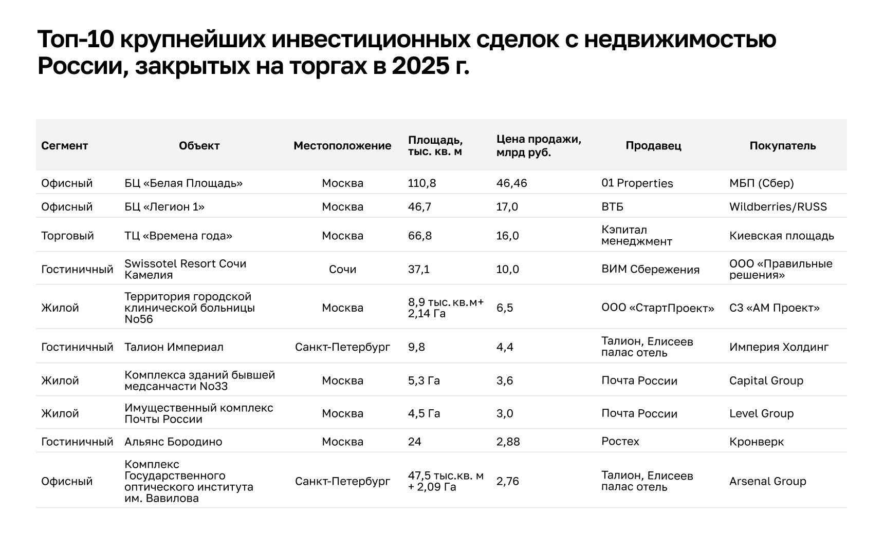 По данным РАД, сегодня основную массу реализуемого на торгах имущества составляют коммерческая, жилая и производственная недвижимость, транспорт, а также долговые обязательства (дебиторская задолженность). В CORE.XP выделяют рост доли аукционов в ритейле (+21 п.п., до 25%), гостиницах (+14 п.п., до 19%); умеренную положительную динамику в офисах (+1 п.п., до 28%). Рост в ритейле связан с крупной транзакцией – продажей ТЦ «Времена года», уточняют в компании. «В Москве наиболее высоким спросом у инвесторов на торгах в первом полугодии пользовалась офисная недвижимость, которая лидировала как по количеству сделок, так и по объёму вложений, — сообщает Виктор Заглумин, сооснователь и партнер Bright Rich | CORFAC International. — В условиях низкой вакансии и высокой себестоимости строительства покупка готового объекта является привлекательной стратегией. В Петербурге же объекты чаще всего приобретались с целью редевелопмента. Торги здесь становятся эффективным способом купить недооценённый актив с потенциалом увеличения капитализации. Показательный пример – продажа комплекса зданий бывшего СИЗО “Кресты” в Санкт-Петербурге, который был реализован по цене в 27,5 тыс. рублей за кв. м, что существенно ниже рыночной цены». Эта история – наглядный пример того, что даже очень сложные и капиталоёмкие объекты при правильной упаковке находят покупателя, подчёркивает Елена Степанова, партнёр, руководитель практики недвижимости и строительства CLS.