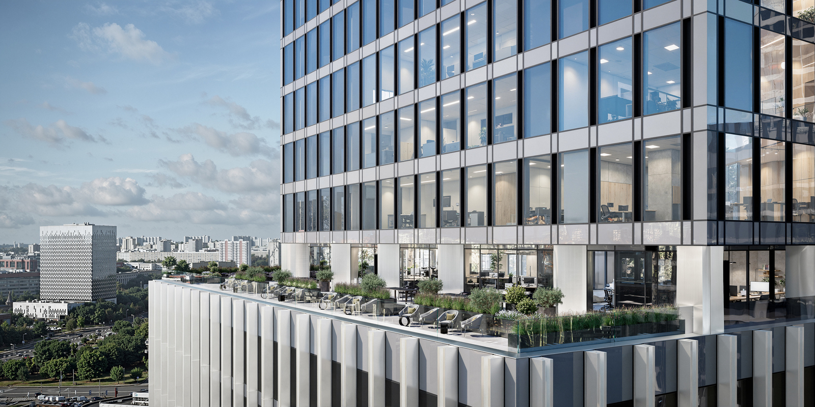 «Офисный квартал получит сложную объемно-пространственную структуру, формирующую выразительный силуэт. Обращенные к площади офисные башни высотой в 23 и 20 этажей будут завершаться парящими стеклянными объемами, отделенными от “оснований” с помощью террас. 13-этажный корпус, напротив, представляет собой статичный и строгий объем».