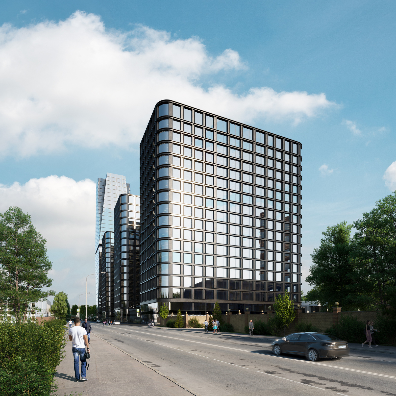 Фасады корпусов будут представлять собой лаконичную сетку, образующуюся за счет фактурных горизонтальных поясов и вертикальных глухих пилонов, выполненных из темного металла. Первые два этажа выполнят из витражей с моллированным остеклением на углах здания, что сделает их максимально открытыми для города. Объемы павильонов выполнят в едином стилевом решении с нижними этажами корпусов.
