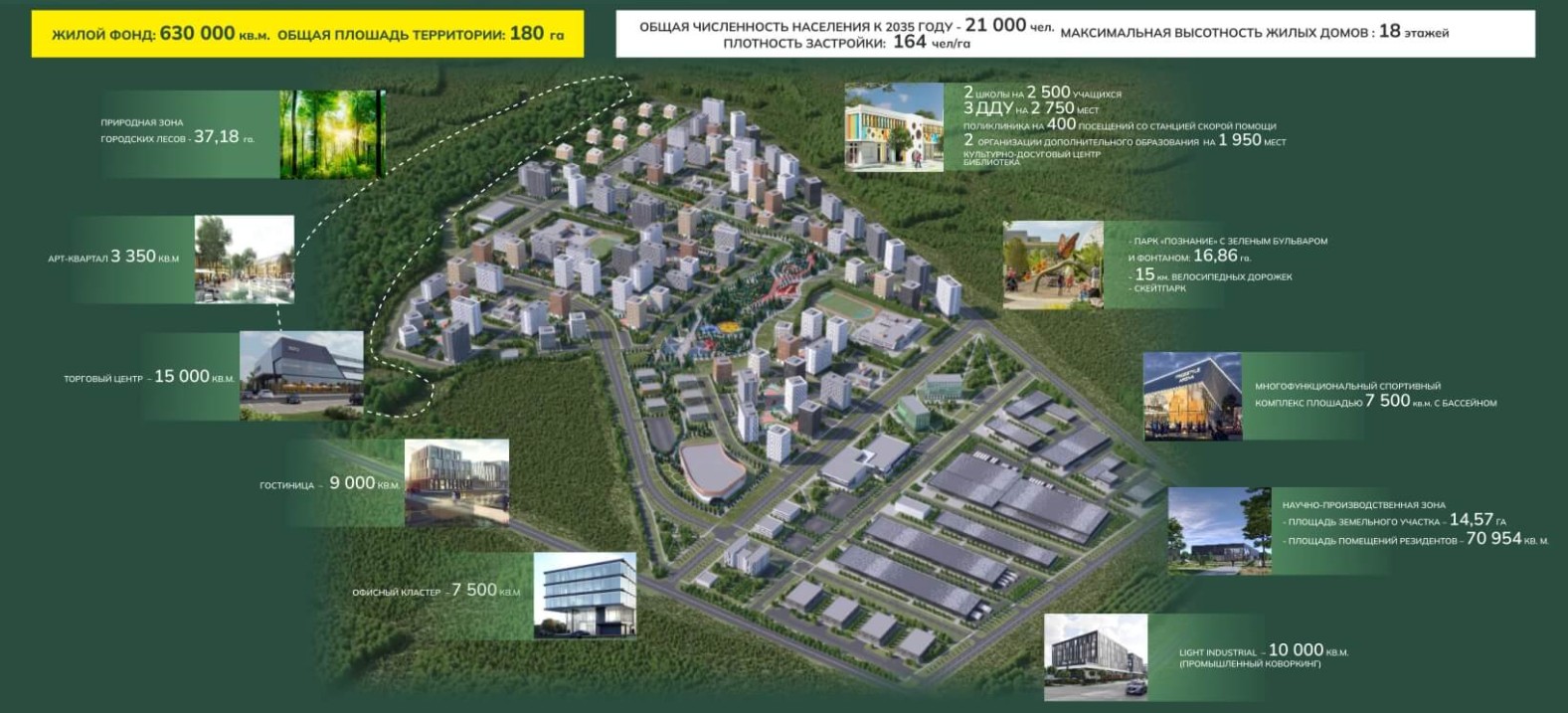С 2026 года на территории свыше 180 га стартует строительство: жилой фонд — 630 тыс. кв. м, научно-производственные помещения — более 70 тыс. кв. м, а также деловая и социальная инфраструктура: школы, детские сады, медицинские центры, спортивный комплекс, арт-квартал, офисы и уникальный парк площадью 17 га, объединенный пешеходными и веломаршрутами с 37 га леса. В парке предусмотрено около 100 функциональных зон для досуга, прогулок, социальных взаимодействий жителей всех возрастов в любое время года.