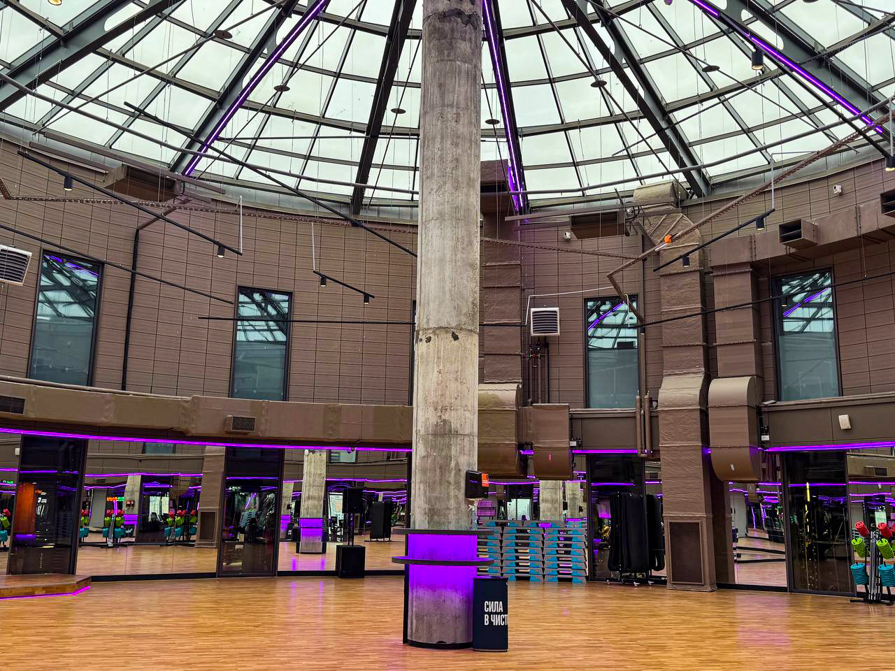 Для восстановления после тренировок предусмотрена спа-зона с сауной и хаммамом. Среди архитектурных особенностей локации — панорамное остекление фасада и световой купол, создающий дополнительные визуальные акценты в интерьере.
