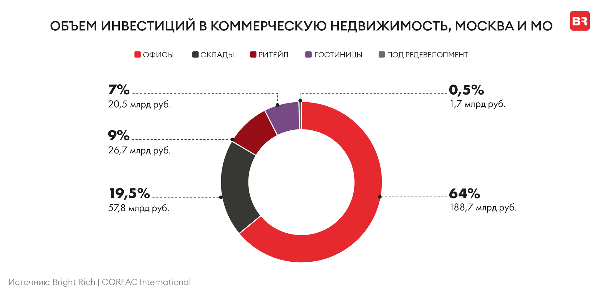 В структуре вложений по сегментам произошли изменения: доля офисов увеличилась с 61% до 64% (188,7 млрд руб.), складской сегмент снизил долю с 23% до 19,5% (57,8 млрд руб.). Инвестиции в ритейл выросли с 7% до 9% (26,7 млрд руб.), гостиничная недвижимость — с 1% до 7% (20,5 млрд руб.). Редевелопмент почти вышел из структуры сделок: его доля упала с 8% до 0,5% (1,7 млрд руб.).