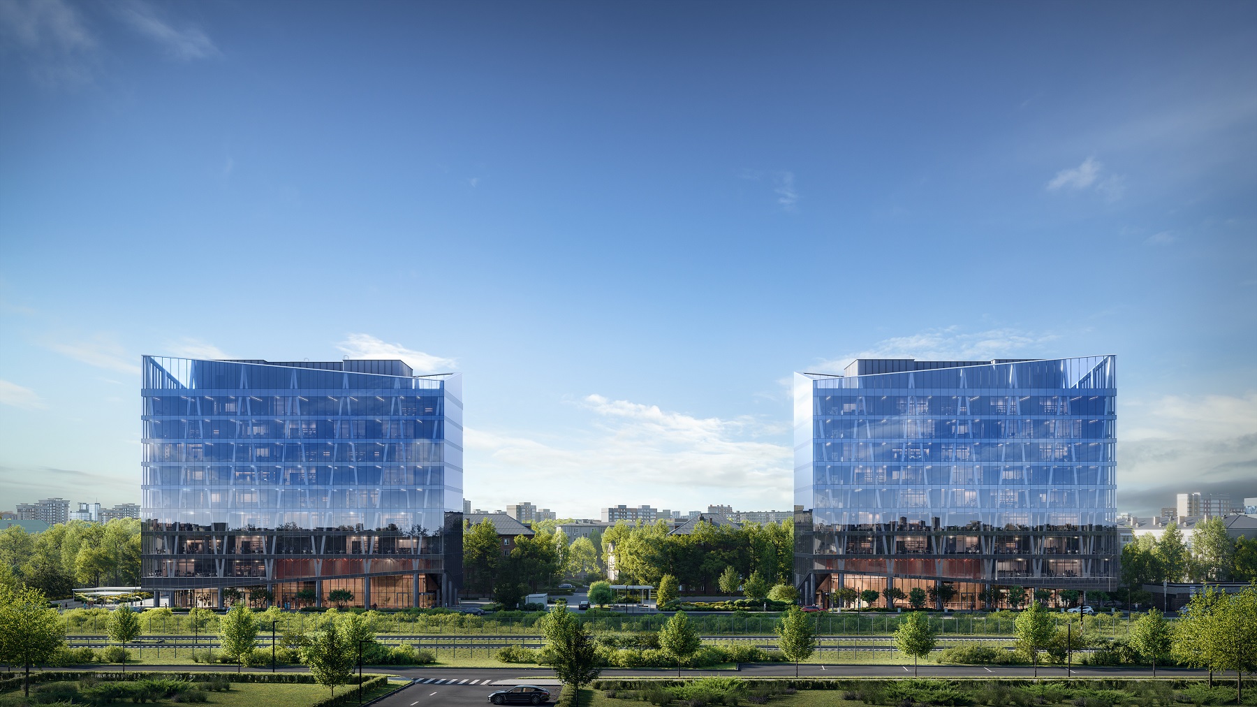 Проект выделяется своей архитектурной концепцией: стеклянные фасады, двухсветные лобби с 9-метровыми потолками, светлая отделка с яркими акцентами и продуманная функциональность офисных этажей, где высота потолков составляет 3,6–3,7 м. На первых этажах появятся помещения под ритейл, а на кровлях обоих корпусов предусмотрены открытые террасы для работы и отдыха.