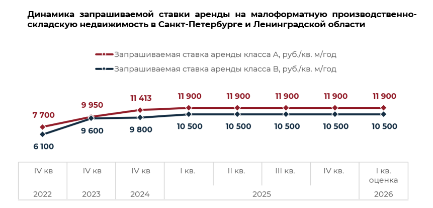По итогам 2025 года средневзвешенная запрашиваемая ставка аренды на объекты малоформатной производственно-складской недвижимости в Санкт-Петербурге и Ленинградской области составила 11 900 руб. за кв. м в год (без НДС и операционных расходов) для объектов класса А и 10 500 руб. за кв. м в год для объектов класса В. С учетом НДС (без операционных расходов) запрашиваемая ставка аренды для объектов класса А составляет около 14 500 руб. за кв. м в год. Для объектов класса В чаще применяется упрощенная система налогообложения (УСН). В целом за год уровень запрашиваемых ставок аренды на такие помещения (без НДС и операционных расходов) остался стабильным.