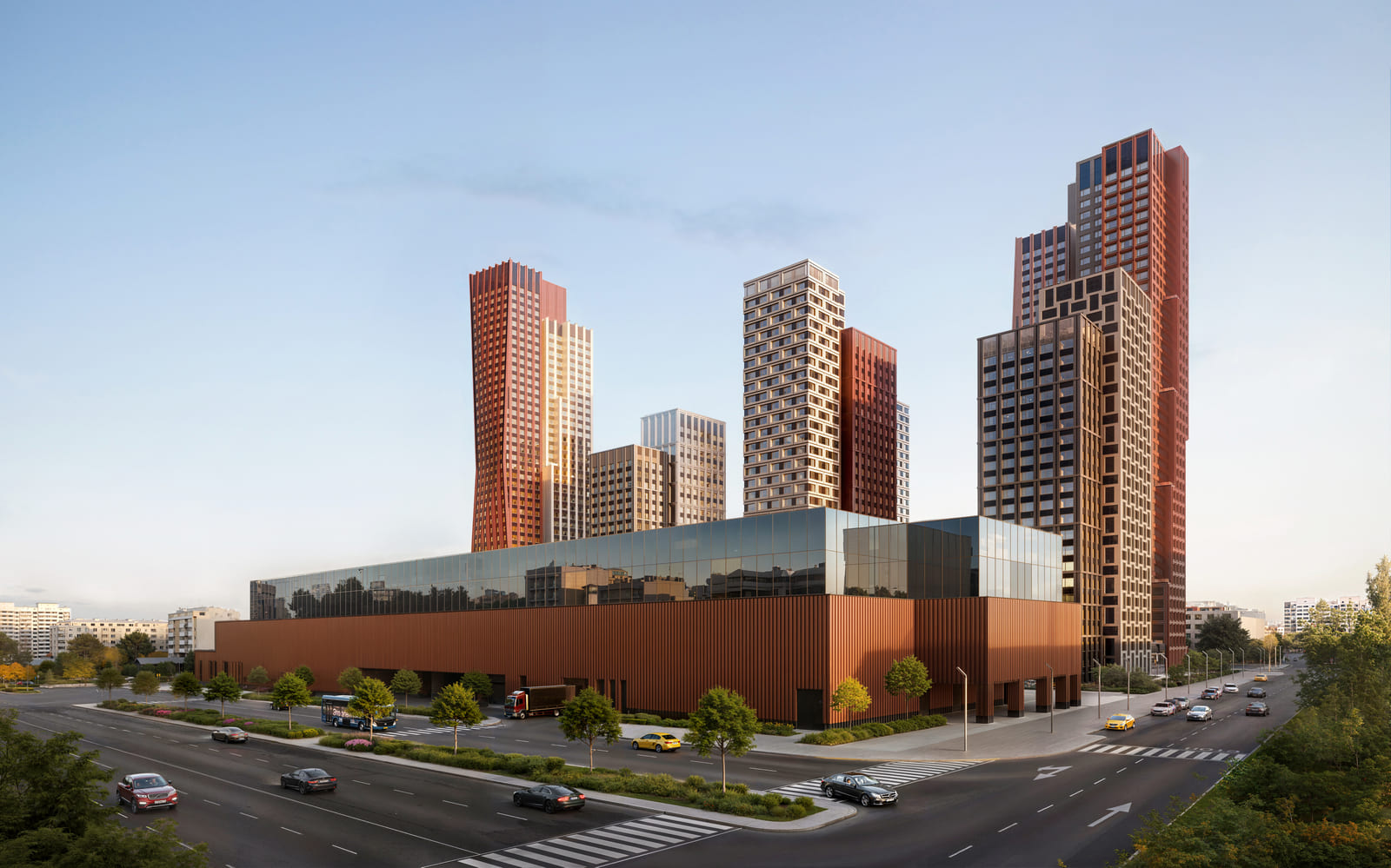 Объект оборудован 11 лифтами, пять из которых грузовые, и террасой площадью 1,7 тыс. кв. м. На подземном уровне разместят паркинг на 231 машино-место, а прилегающая территория будет благоустроена.