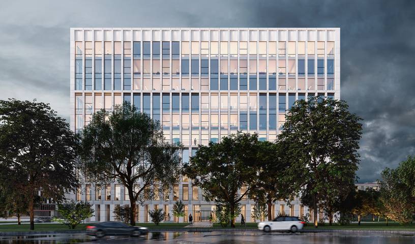 Архитектором проекта выступило бюро WALL. Фасады офисного здания будут выполнены из натурального камня светлого оттенка. По всему периметру предусматривается остекление в пол с возможностью естественного проветривания.