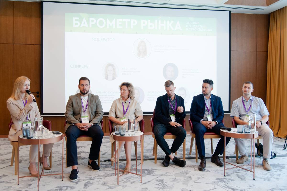 Сергей Баранов, директор по коммерческой недвижимости AFI Development; Иван Барсола, исполнительный директор, Дирекция по ESG, Сбер; Захар Вальков, исполнительный директор Radius Group; Артем Володькин, управляющий директор Национального центра Государственно-частного партнерства (ГЧП); Алла Тигнер, коммерческий директор О1 Standard.