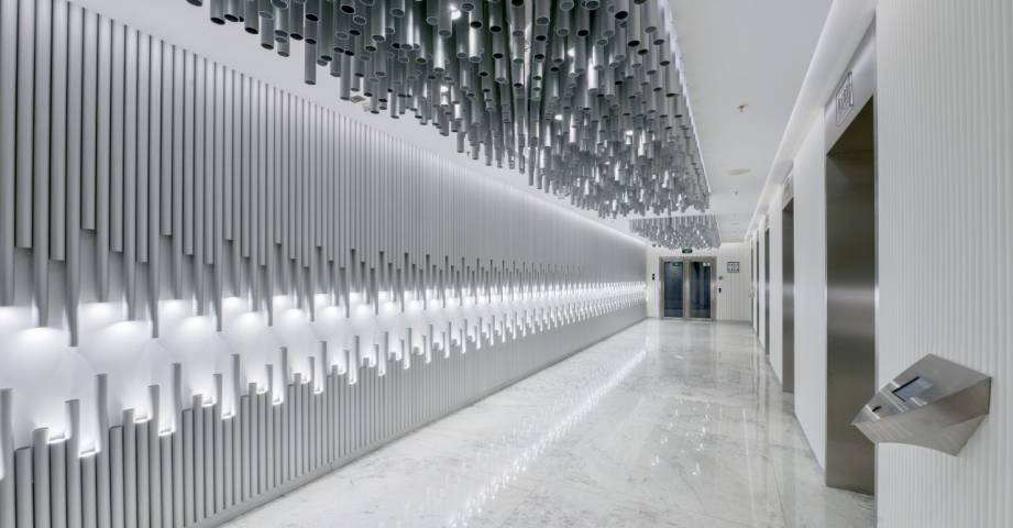 Готовая отделка офиса соответствует требованиям арендаторов к премиальным помещениям класса А. Напольное покрытие в лифтовых холлах выполнено из керамогранита. Акцентами в дизайне потолка и стен стали конструкции из труб со встроенным освещением. В коридорах и общественных зонах потолок офиса оформлен с применением «бумажного» материала с противопожарной пропиткой. Дизайн стен выполнен с использованием HPL-панелей.