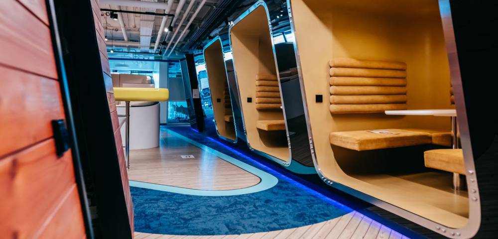 В Москве наш каждый этаж выполнен в своем стиле – от домашнего Hygge до приключенческого морского. Питерский – вдохновлен великими прорывами и технологическими открытиями. Казанский – современным искусством, технологиями и культурой республики Татарстан. Наши сотрудники могут свободно перемещаться по офису и выбирать, где им удобнее и приятнее работать, – смена обстановки разгружает мозг и снижает риск выгорания.