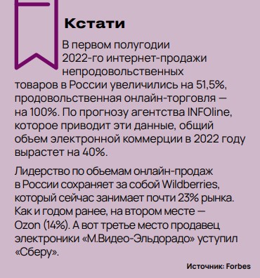 С введением санкций и уходом из России ряда брендов маркетплейсы снова оказались быстрее, выше, сильнее: одни – привозя исчезнувшие товары по схеме параллельного импорта, другие – приводя соответствующих игроков, третьи – открывая в других странах целые направления по работе с международными продавцами. «А потребитель совершает покупку так, как ему удобно прямо сейчас, – резюмирует Федор Вирин, партнер Data Insight. – И, если мы, например, делаем запас продуктов домой, то купить их онлайн очень удобно: они приедут к порогу квартиры самостоятельно, и не нужно их загружать в машину, выгружать из машины и нести. Но вот если мы идем в гости и хотим принести тортик, то купим его по дороге в ближайшем к “цели” магазине, чтобы не нести далеко большую коробку со сладким, которую нельзя переворачивать. Если мы покупаем стиральную машину, то