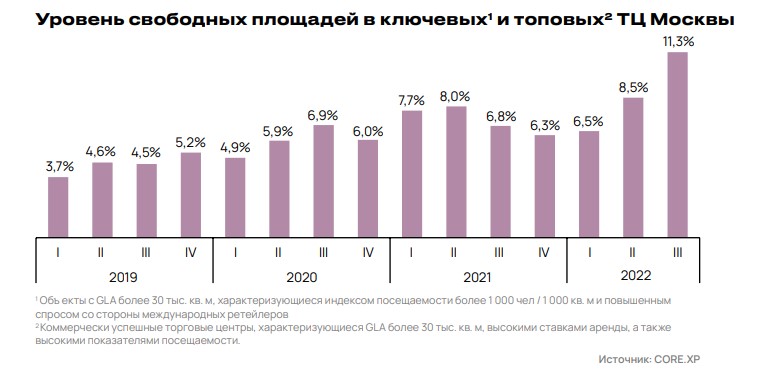 Хотя, по данным Focus Technologies, разрыв между показателями посещаемости торговых центров Москвы этого и прошлого года начал расти уже в августе, первые две недели после объявления частичной мобилизации добавили к отставанию еще три процентных пункта по сравнению с двумя первыми неделями сентября, сообщают в Commonwealth Partnership (CMWP). Макроэкономические и геополитические факторы будут и дальше оказывать давление на покупательскую способность, а доля свободных площадей в форматных торговых объектах по итогам III квартала 2022 года составила 11,5%. Но к концу года показатель может достичь 20%, прогнозируют в CMWP: хотя локальные и ряд турецких брендов рассматривают возможности заполнения освободившихся площадей, снижение потребительской активности в среднесрочной перспективе будет сдерживать развитие ретейлеров, что, в свою очередь, драматично скажется на состоянии объектов недвижимости.