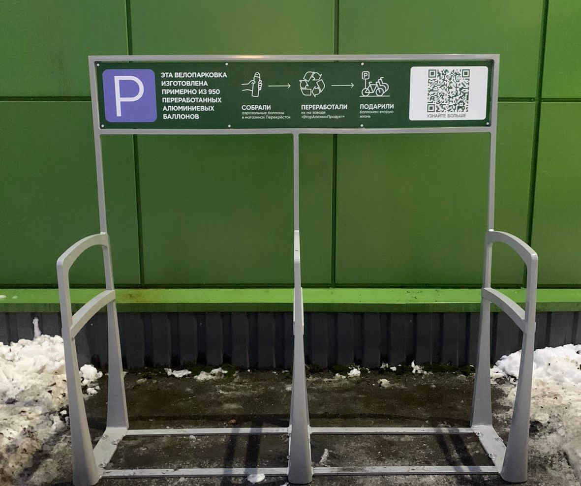 Торговая сеть «Перекрёсток» совместно с компанией Unilever в России установили восемь велопарковок из переработанных аэрозольных баллонов у супермаркетов в Санкт-Петербурге.