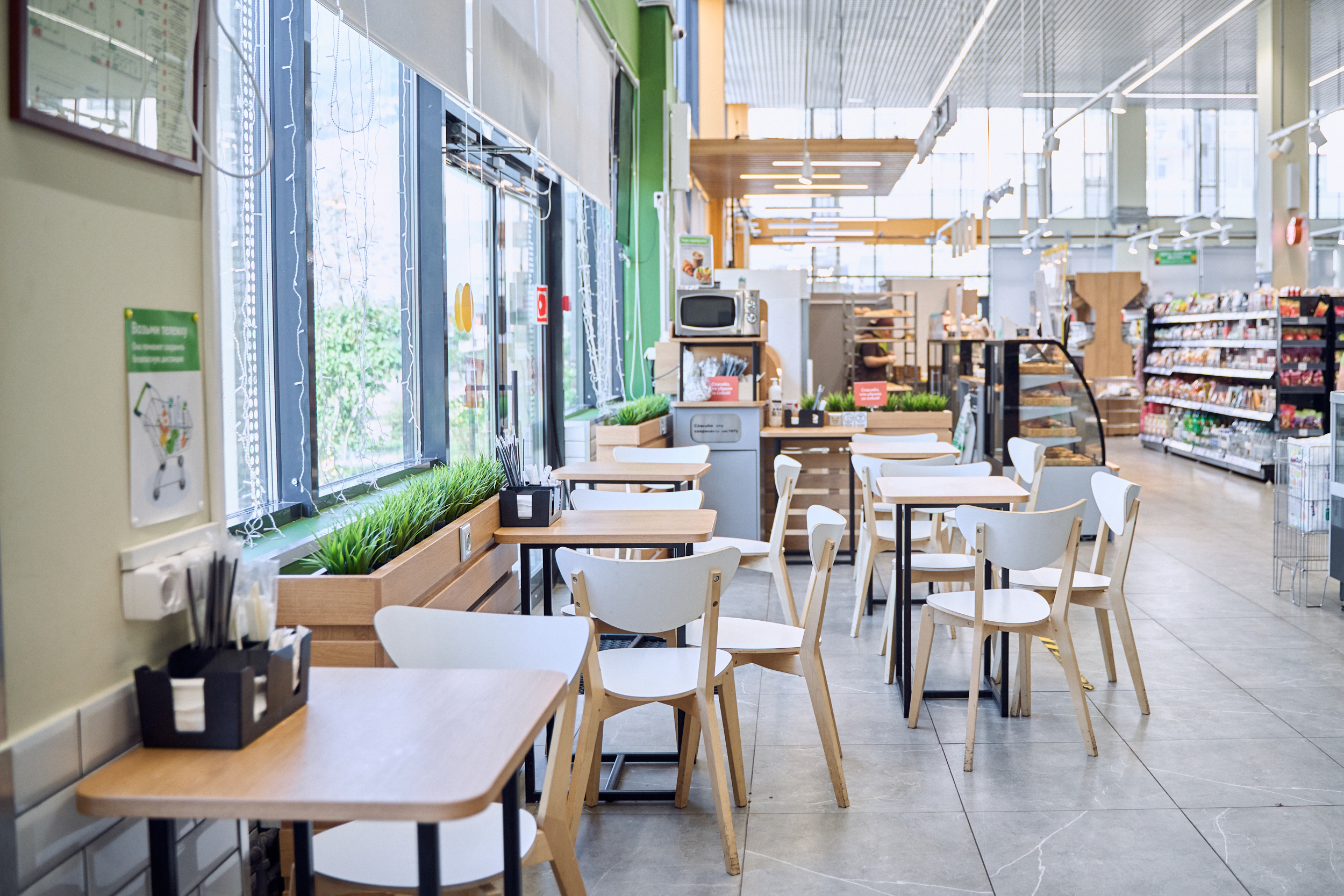 - Пока такие зоны в магазинах не создают атмосферы ресторана/кафе, и это, скорее, альтернатива обеду/завтраку / ужину вне дома, но – не полноценная замена ресторанам.