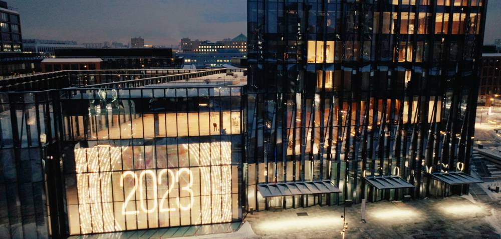 Башня имеет сплошное остекление, поэтому экран, обращенный на улицу, разместили внутри здания: светодиодные ламели медиаэкрана вмонтированы в оконные рамы с внутренней стороны. В стандартном виде такая конструкция имеет наружное исполнение и крепится на фасад с определенным отступом, что создает препятствия для полноценной инсоляции помещений и портит вид из окна. Решение, примененное в этом случае, делает фасад абсолютно невидимым, когда он выключен.