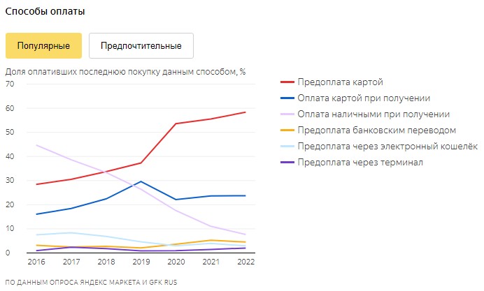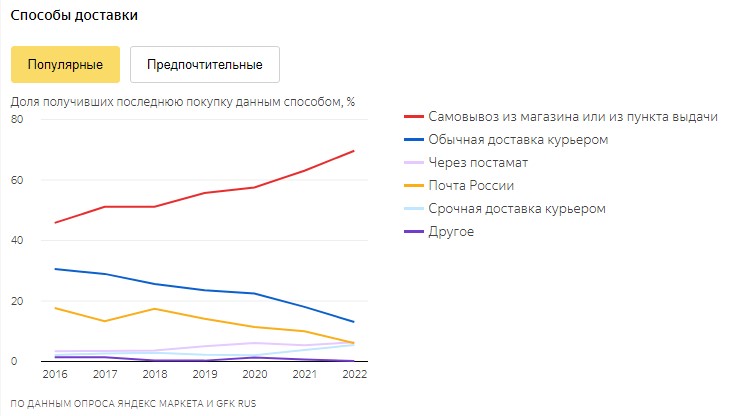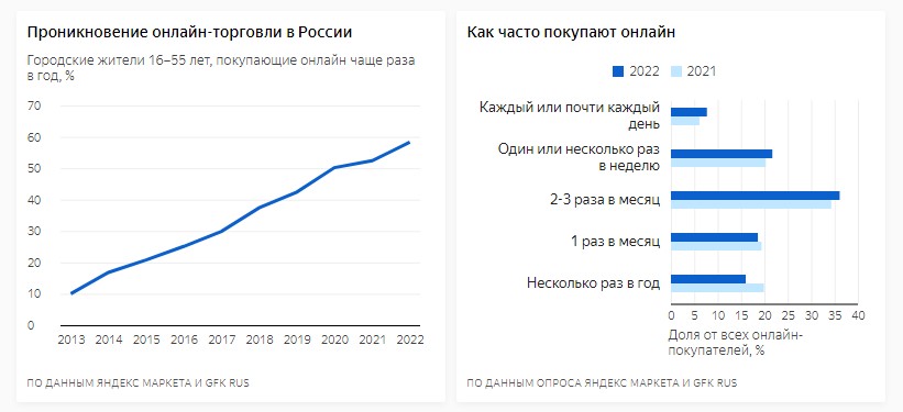 За последние пять лет число онлайн-покупателей в России выросло почти вдвое: сейчас в интернете не реже двух раз в год покупают примерно 60 % городских жителей 16-55 лет, сообщают, в свою очередь, авторы исследования Яндекс Маркета и GfK Rus. Почти 85% из них делают заказы минимум раз в месяц, почти 30% — минимум раз в неделю. Самая популярная категория товаров — одежда и обувь для взрослых, эти товары хотя бы раз в течение года покупали онлайн более 65% респондентов. Затем идут средства личной гигиены (64%), на третьем месте — продукты питания (55%). Самый распространённый способ получения заказа — самовывоз из магазина, пункта выдачи или постамата, именно так получили свою последнюю покупку 76% респондентов. На втором месте — курьерская доставка (12%). Почту и срочную курьерскую доставку россияне используют примерно одинаково часто — в 5–6% случаев.