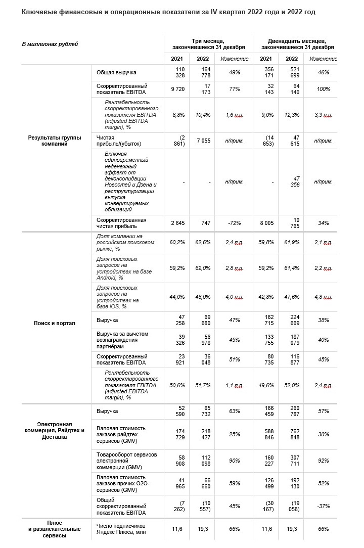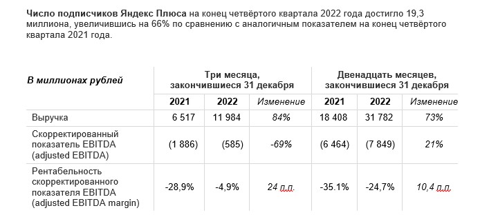 Выручка в сегменте Плюса и развлекательных сервисов в четвёртом квартале 2022 года выросла на 84% по сравнению с аналогичным показателем за четвёртый квартал 2021 года. Рост в основном обусловлен увеличением доходов от продаж подписки Яндекс Плюс на фоне роста общего числа платящих подписчиков и перехода на единый семейный тариф Плюс Мульти. На рост выручки также повлияла хорошая динамика доходов от рекламы и доходов Яндекс Афиши. Убыток по скорректированному показателю EBITDA существенно уменьшился — с 1,9 миллиарда рублей в четвёртом квартале 2021 года до 0,6 миллиарда рублей в четвёртом квартале 2022 года. Такая динамика объясняется эффектом положительного операционного рычага на фоне роста выручки от продажи подписок.