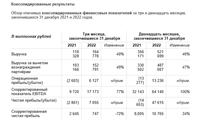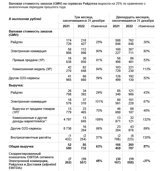 Убыток по скорректированному показателю EBITDA (adjusted EBITDA) сегмента Электронной коммерции, Райдтеха и Доставки в четвёртом квартале 2022 года составил 10 557 миллионов рублей по сравнению с 7 262 миллионами рублей в четвёртом квартале 2021 года, при этом маржинальность по показателю скорр. EBITDA как процент от выручки улучшилась. Увеличение убытка в абсолютном выражении в первую очередь обсуловлено ростом масштаба бизнесов сегмента Электронной коммерции, а также приобретением Delivery Club.
