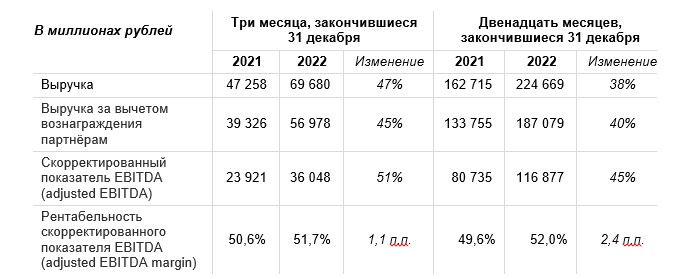 Рентабельность скорректированного показателя EBITDA (adjusted EBITDA margin) в четвёртом квартале 2022 года достигла 51,7% по сравнению с 50,6% в четвёртом квартале 2021 года. Рост рентабельности в основном обусловлен эффектом положительного операционного рычага на фоне уверенного роста рекламной выручки и оптимизации расходов (в основном маркетинговых), а также положительного эффекта от выделения корпоративных расходов в сегмент Прочих бизнес-юнитов и инициатив. Всё это помогло уменьшить негативный эффект от увеличения расходов на персонал в связи с изменением программы компенсаций в компании и, как следствие, включением в расчёт скорректированного показателя EBITDA компенсационных расходов, связанных с выплатой сотрудникам дополнительных денежных вознаграждений взамен невозможных к реализации опционов.