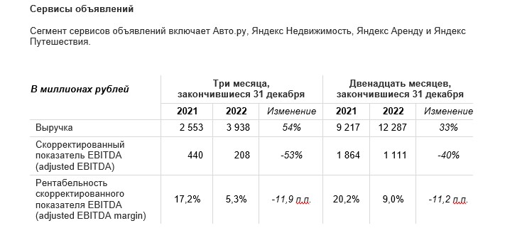 Выручка в сегменте сервисов объявлений в четвёртом квартале 2022 года выросла на 54% по сравнению с аналогичным показателем за четвёртый квартал 2021 года. Такая динамика обусловлена хорошими результатами Яндекс Путешествий и Яндекс Недвижимости, которых удалось добиться благодаря растущему спросу на наши сервисы и изменению конкурентной среды на внутреннем рынке начиная со второго квартала 2022 года. Однако устойчивый рост сегмента был компенсирован негативным влиянием падения выручки от услуг сервиса автомобильных объявлений, вызванного резким спадом предложения на рынке новых автомобилей. Скорректированный показатель EBITDA (adjusted EBITDA) в четвёртом квартале 2022 года составил 0,2 миллиарда рублей по сравнению с 0,4 миллиарда рублей в четвёртом квартале 2021 года в результате увеличения расходов на рекламу и маркетинг, инвестиций в новые направления бизнеса, такие как Яндекс Аренда, а также расходов на персонал для поддержки развития сервисов.