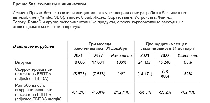 Убыток по скорректированному показателю EBITDA составил 7,6 миллиарда рублей (включая 1,8 миллиарда инвестиций в Yandex SDG), что в абсолютном выражении ниже 5,6 миллиарда рублей в четвёртом квартале 2021 года, несмотря на удвоение выручки сегмента. Улучшение относительных убытков (в процентах от выручки) было обусловлено в основном хорошими результатами сегмента Устройств (которые остаются прибыльными по скорр. EBITDA третий квартал подряд), повышением операционной эффективности сервисов Yandex Cloud и Яндекс Практикум, а также положительным эффектом от деконсолидации Дзена и оптимизацией инвестиций в некоторые экспериментальные направления (например, закрытие зарубежного бизнеса Яндекс Лавки). Все эти улучшения помогли компенсировать эффект от продолжающихся инвестиций в Yandex SDG и развитие вертикали Финтеха, а также от переноса нераспределённых корпоративных расходов, не относящихся к сегментам напрямую, из скорр. EBITDA отчётных сегментов в скорр. EBITDA Прочих бизнес-юнитов и инициатив (с третьего квартала 2022 года).