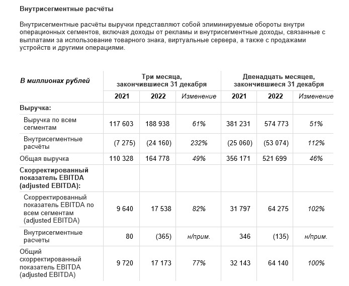 Внутрисегментные расчёты выручки в четвёртом квартале 2022 года увеличились на 232% по сравнению с аналогичным показателем за четвёртый квартал 2021 года. Этот рост был в основном связан с внутригрупповыми элиминируемыми оборотами выручки, которые растут по мере того, как группа компаний Яндекса расширяется и связи между разными сервисами усиливаются. Элиминируемые обороты выручки связаны с перекрёстными рекламными и маркетинговыми кампаниями разных сервисов, продажей устройств, платой всех бизнес-юнитов за использование дата-центров, другой IT-инфраструктуры и прочих централизованных сервисов.