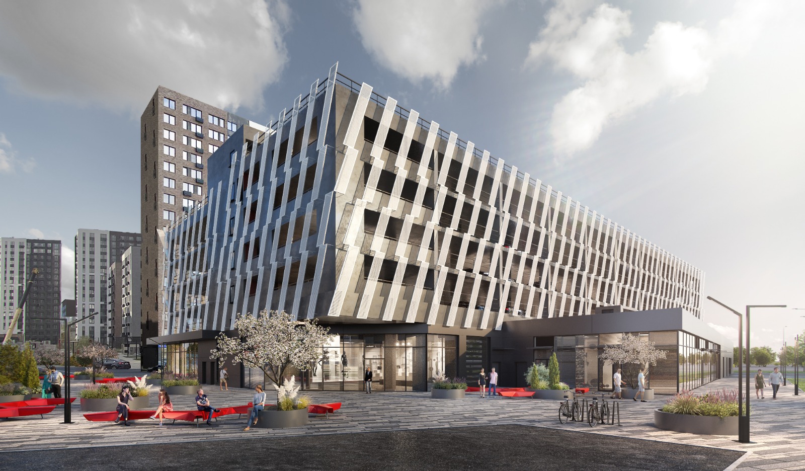 На первом этаже вдоль всего фасада разместятся коммерческие помещения. Расположение объекта делает возможным круглосуточный режим работы - помещения мультипаркинга приспособлены под открытие минимаркета, аптеки или цветочного магазина в формате 24/7. Проектом также предусмотрена возможность размещения в здании кафе, спортивных и хобби-объектов.