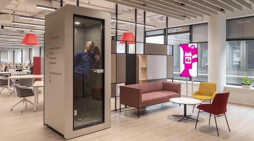 Внутри оборудованы как классические зоны опенспейс, так и гибкие рабочие места хот-деск различного формата. Нетривиальной, с функциональной точки зрения, выстроена и креативная зона с мобильными мебельными модулями. Они работают как детский конструктор и позволяют легко моделировать необходимые конфигурации.