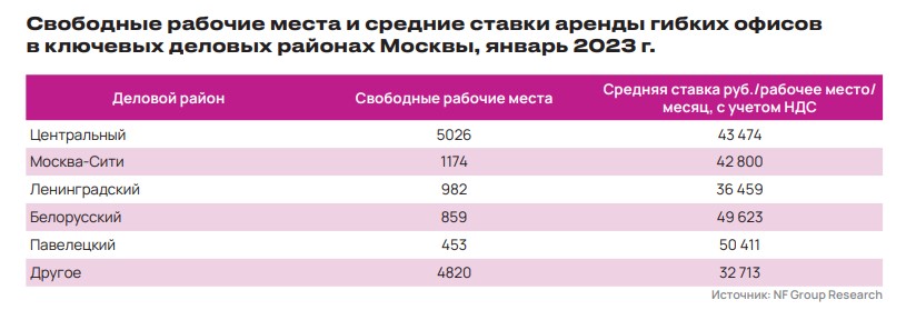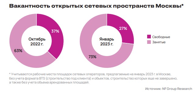 В свою очередь, в NF Group снижение доли свободных рабочих мест на площадках сетевых операторов в Москве оценивают в 10 п. п. (с октября 2022 года) и 27% вакансии в результате закрытия ряда крупных сделок на рынке; таким образом, 73% рабочих мест остаются заполненными. Мария Зимина, партнер, директор департамента офисной недвижимости NF Group, уточняет, что, по сравнению с I кварталом 2022 года, вакантность оказалась выше всего на 4 п. п. В январе 2023 года больше всего свободных рабочих мест оставалось в Центральном деловом районе (более 5000) и ММДЦ «Москва-Сити» (более 1170).
