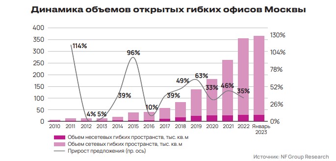 По данным CORE.XP на начало 2023 года, объем предложения гибких офисных пространств в Москве составил 404 тыс. кв. м, увеличившись на 29% в годовом сопоставлении. В 2022 году в Москве были открыты 30 новых площадок площадью около 115 тыс. кв. м. Основными сегментами, формирующими спрос на рынке, стали финансовые организации (в том числе, с государственным участием), доля которых выросла с 2% в 2021 году до 17% в 2022 году, а также сектор «консалтинг и бизнес-услуги» (15% объема новых сделок в 2022 году по сравнению с 3% в 2021 году). В тройку лидеров по-прежнему входит сегмент «IT и телеком», однако его доля в 2022 году снизилась до 5% по сравнению с 15% в 2021 году.